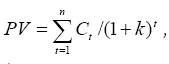 где k — средневзвешенная стоимость капитала (по различным элементам). Очевидно, что комбинация элементов капитала не окажет влияния на прогнозируемые на весь капитал денежные потоки Сt (их значение определяется спросом на выпускаемую продукцию, эффектом операционного рычага и т.п.). Комбинация элементов капитала может отразиться на значении средней стоимости капитала. Теория структуры капитала рассматривает это влияние.