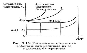 Введение в рассмотрение затрат по организации дополнительного привлечения заемного капитала и издержек возможного банкротства при большом финансовом рычаге меняет поведение кривых стоимости капитала при увеличении заемного финансирования. С ростом финансового рычага стоимость заемного и акционерного капитала растет, что показано на рис. 5.16.