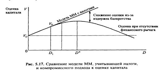 На рис. 5.17 D1/V — уровень финансового рычага, на котором издержки банкротства материализуются в денежной форме; D*/V — оптимальная структура капитала, при этом значении финансового рычага предельные налоговые выгоды равны предельным издержкам банкротства.