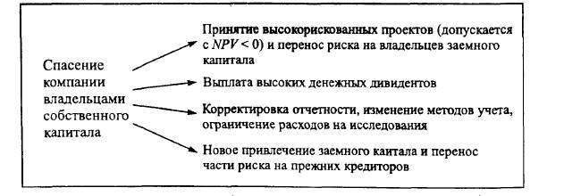 Издержки банкротства зависят от вероятности разорения и ликвидации компании и величины издержек, связанных с этим процессом. При небольших займах вероятность разорения низка и издержки банкротства также невелики. Преимущества в налогообложении приводят к росту рыночной оценки капитала компании. При большом финансовом рычаге вероятность банкротства увеличивается, и налоговые преимущества могут не покрывать растущих издержек банкротства. Есть еще один момент, который усугубляет предбанкротную ситуацию, он связан с возможностью оппортунистического поведения менеджеров и владельцев собственного капитала (об этом упоминалось в гл. 1 при рассмотрении агентского конфликта между владельцами собственного и заемного капитала). В предбанкротной ситуации акционеры часто отказываются от цели максимизации рыночной оценки всего капитала и начинают действовать в своих интересах. Часто используемый способ спасения компании — рискованная игра за счет владельцев заемного капитала.