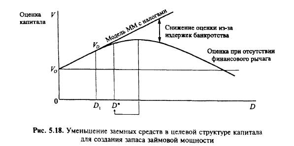 Рекомендацией сигнальной модели по формированию целевой структуры капитала является поддержание запаса займовой мощности для привлечения капитала в условиях асимметричности информации. Оптимальная структура капитала по компромиссной модели является оптимальной только в статичном рассмотрении. Если учитывать потребности будущего привлечения капитала, когда информация будет асимметричной (а это наиболее распространенная ситуация), то доля заемного капитала должна быть меньше, чем значение D* /V (значение, при котором уравниваются предельные выгоды налогового щита и предельные издержки банкротства). Выбор по сигнальной модели показан на рисунке 15.18.