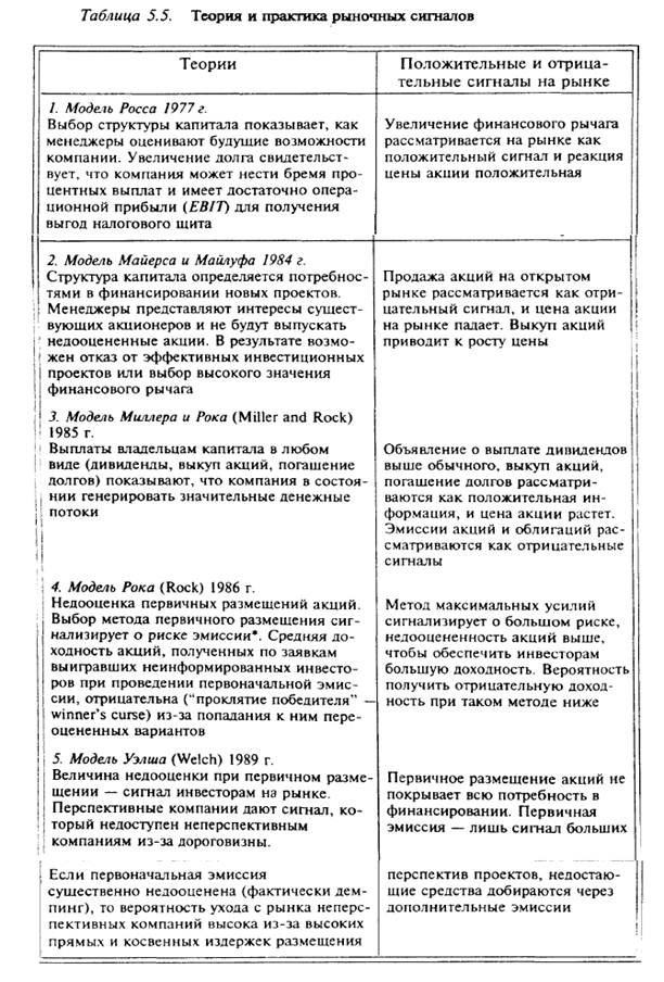 Если работа менеджера ставится в зависимость от рыночной оценки капитала, то можно на основе сигнальных моделей сформулировать рекомендации по подаче рынку сигналов. Схематично выводы по наиболее интересным моделям и рекомендации приведены в табл. 5.5.