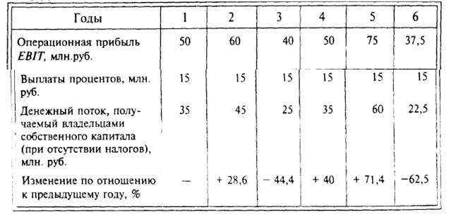 Компания УХ идентична компании ХУ, но использует заемные средства (частично финансируется собственным капиталом и частично заемным). По заемному капиталу предполагаются ежегодные процентные выплаты в размере 15 млн. руб. (эта величина постоянна). Денежные потоки компании УХ имеют вид: