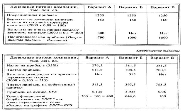 Компания рассматривает проект расширения, который потребует 3 млн. ден. ед. Финансовый менеджер анализирует три варианта финансирования и соответственно три варианта структуры капитала (предполагается, что издержки по привлечению и размещению капитала отсутствуют):