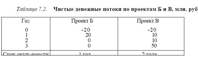 • не учитываются чистые денежные потоки за пределами срока окупаемости. Из-за этого выбор из альтернативных проектов по методу срока окупаемости может привести к ошибочным результатам. Например, рассмотрим проекты Б и В, чистые денежные потоки по которым приведены в табл. 7.2