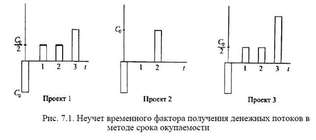 С точки зрения срока окупаемости три проекта, чистые денежные потоки по которым изображены на рис. 7.1, равноценны. (Инвестиционные затраты представлены отрицательным денежным потоком.) Срок окупаемости по трем проектам равен двум годам. Однако, очевидно, что проект 3 при любой временной стоимости денег предпочтительнее проекта 1.