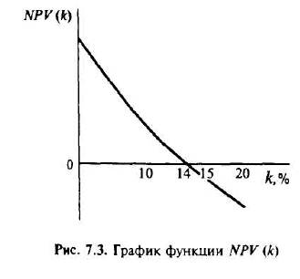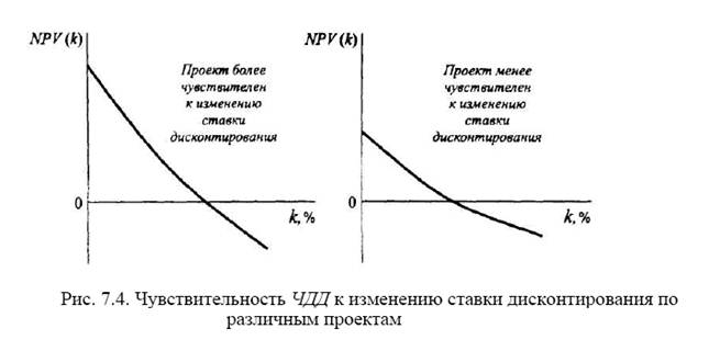 По графику NPV(k) можно сделать вывод о чувствительности проекта к ставке дисконтирования. Чем круче кривая NPV(k) (больше угол к оси абсцисс), тем более чувствителен проект. Небольшие изменения в ставке дисконтирования сильно повлияют на изменение чистого дисконтированного дохода (см. рис. 7.4).