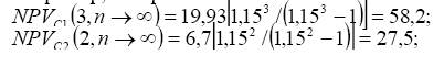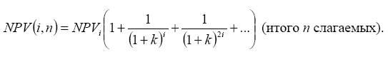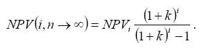 При большом числе слагаемых в формуле NPV(i, n), особенно если сравнивается много проектов, расчет может быть упрощен введением предположения о возможности неограниченного числа раз реализации проектов (n по всем ∞ → проектам). Предельное значение ЧДД по каждому проекту на продолженном сроке функционирования может быть найдено по формуле