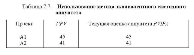 Рассмотрим проекты А1 и А2 с неравными сроками функционирования (табл. 7.6).