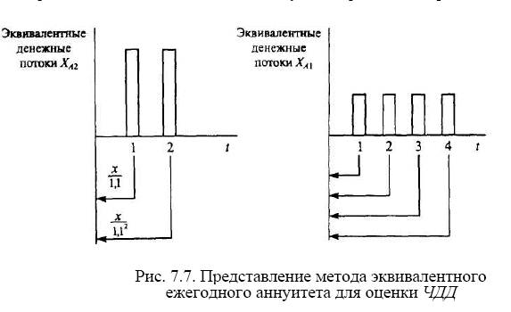 Рассмотрим использование метода для проектов А1 и А2, рассчитанных соответственно на 4 и 2 года (см. табл. 7.7 и рис. 7.7).
