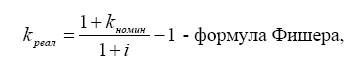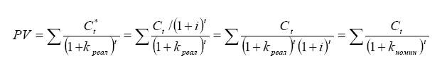 Теоретически полученное значение текущей оценки и чистого эффекта (NPV) должно совпадать с вариантом расчета в номинальных значениях (исходя из формулы Фишера, устанавливающей связь между реальной и номинальной процентными ставками):