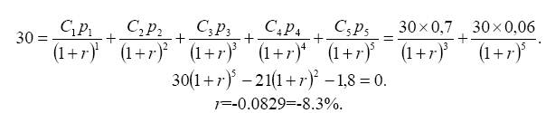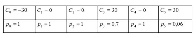 Для оценки BHM(IRR) требуется рассчитать денежные потоки по проекту. С точки зрения Общества поддержки малого бизнеса, в текущем (нулевом) году отток денежных средств равен 30 тыс., с вероятностью 0,7 в году 3 30 тыс. ден. ед. будут возвращены и с вероятностью 0,3 в году 3 притока денежных средств не произойдет. Если притока не будет в году 3, тогда он может произойти в году 5. Вероятность этого также равна 0,3. Однако и в году 5 эксперты не оценили со 100%-й вероятностью возможность погашения ссуды. Общая вероятность получить в году 5 30 тыс. ден. ед. равна произведению вероятностей 0,3 х 0,2 = 0,06.