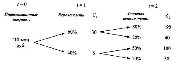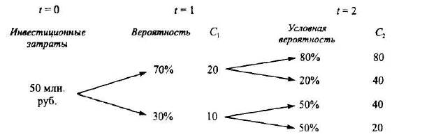 Предполагается, что денежные потоки по проектам взаимозависимы, т.е. поток года t = 2 зависит от потока года t =1. Вероятностные распределения денежных потоков известны. Безрисковая ставка процента — 0,1.
