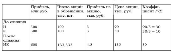 Слияние строится на обмене акций К на новые акции И. Из соотношения рыночных цен имеем, что на 3 акции К будут выпущена 1 акция И. Для компенсации акционерам К будет выпущено дополнительно 33333 акции И (взамен 100 тыс. акций К). После слияния в обращении будет находиться 133,333 тыс. акций. Значение прибыли на акцию будет рассчитываться как отношение обшей прибыли к числу акций: 600 млн. руб. / 133,333 тыс. шт. = 4,5 тыс. руб. Возрастание прибыли на акцию является результатом только процесса обмена акций. Если руководство сумеет убедить рынок, что в результате слияния перспективы улучшатся и сохранится соотношение Р/Е, то цена акции И возрастет до 135 тыс. руб. До слияния рыночная цена корпораций составляла: