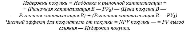 Поскольку в каждый текущий момент рыночная капитализация (как произведение курса акции на количество акций в обращении) может не совпадать с текущей оценкой будущих денежных потоков, генерируемых активами данной компании (PV компании), издержки слияния могут быть представлены суммой надбавки к рыночной капитализации и превышением значения рыночной капитализации над текущей оценкой компании: