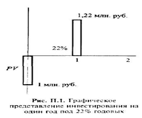 Текущие денежные средства оцениваются выше, чем такая же сумма в будущем, из-за возможности в текущий момент инвестировать их, заработать прибыль и на конкретный будущий момент времени иметь наращенную сумму. Процесс перехода из текущего состояния (от текущей оценки) к будущей оценке денежной суммы называется наращением. Предположим, мы положили на банковский депозит 1 млн. руб. под 22% годовых. В данном случае текущая оценка инвестированной суммы равна 1 млн. руб. (PV = 1 млн. руб.). Процентная ставка инвестирования /равна 22% или 0,22. Процентная ставка (rate of interest)[18] есть относительная величина дохода (доходность) за определенный период времени (как правило, год). За год процент в денежном выражении составит произведение начальной суммы количества на значение процента: 1млн. х 0,22 = 220 тыс. руб. На конец года оценка денежной суммы составит сумму начального значения и процента в денежном выражении: FV1 = PV+ Процент = PV + PV х i = PV х (1 + i). FV1 = 1,22 млн. руб. Схема денежного потока показана на рис. П.1.