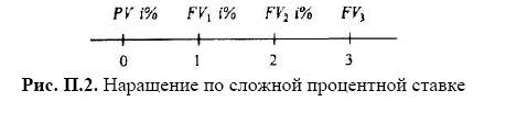 При наращении по сложной процентной ставке ежегодное наращение, начиная со второго года, зависит не только от значения процентной ставки, но и от уже наращенной денежной суммы на начало года. Прирост за второй год зависит от процентной ставки i и FV1: FV2 = PV+ PV x i + FV1 x i = PV + PV x i + PV + PV x i = PV (1 + i)2. Если депозит размещен на срок три года, то процесс наращения может быть показан схемой денежных потоков (рис. П.2):