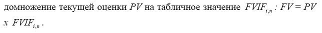 2) с помощью таблицы будущей оценки FVIF i,n(табл. 4 Приложения 2), которая показывает будущую оценку 1 ден. ед. через п периодов времени при процентной ставке, равной i % годовых. FVIF = (1 + i)n, и, следовательно, табличный расчет осуществляется как
