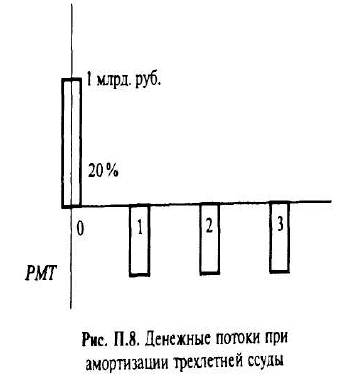 Предположим, корпорация взяла ссуду 1 млрд. руб., и погаше-ние предполагает три равных пла-тежа — в конце будущих трех лет. Кредитор должен получить 20% суммы займа, имеющейся на начало каждого года. Задача заключается в нахождении трех равных платежей (обозначим их величиной РМТ). Схема денежных потоков будет иметь для данного примера вид, показанный на рис. П.8.