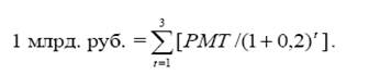 Величина ссуды 1 млрд. руб. является текущей оценкой аннуитета, равного РМТ, на период три года с процентной ставкой 20%. Таким образом, для расчета погасительных сумм РМТ необходимо приравнять текущую оценку (сумму полученной ссуды) к текущей оценке 3-летнего аннуитета. 1 млрд. руб. = PV = РМТ / (1 + i) + РМТ / (1 + i2) + РМТ / (1 + i3); i = 20%;