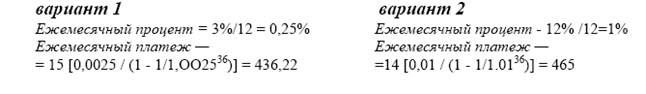 По специальному предложению ежемесячный платеж меньше, и этот вариант лучше. Можно сравнить вариант скидки в 1 тыс. долл. с фактической разницей в текущей оценке двух вариантов. 15 тыс. долл. под 3% адекватны 436,22 долл. ежемесячных платежей. Если рассмотреть вариант выплаты 15 тыс. по ставке 12%, то ежемесячный платеж составит 498,21. Экономия по варианту 1 составит 61,99 долл. Текущая оценка получения экономии в течение 36 месяцев составит 61,99 [(1 — 1/ 1,0136)/0,01] = 1866,34.