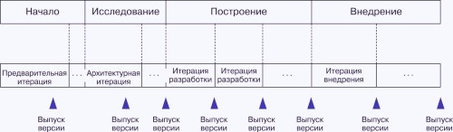 В соответствии с итеративной моделью имеются четыре основные фазы жизненного цикла разработки ПО (начало, исследование, построение и внедрение). На каждой фазе проект проходит множество итераций, приводящих к созданию работоспособных версий: на начальных создаются прототипы, уточняются требования, прорабатываются наиболее сложные проблемы; конечные приводят к созданию продукта, его совершенствованию и расширению функциональности.