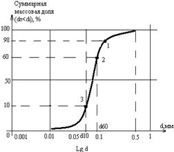 Степень неоднородности пород характеризуют отношением d60/d10, где d60 – диаметр частиц, при котором сумма масс фракций с диаметром 0£dЗ£d60 состовляет 60 % от массы образца породы (массы всех фракций; точка 2 на рис. 2), d10 – аналогичная величина для 10 % массы всех фракций.