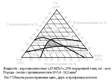 Экспериментально опытами установлено, что, в зависимости от объемного насыщения порового пространства различными компонентами (нефть, вода, газ) возможно одно-, двух- и трехфазное движение флюидов. Результаты опытов обычно изображают в виде треугольных диаграмм (рис.7) На диаграмме нанесены кривые, соединяющие точки с одинаковым (некоторым минимальным, пороговым) соответствующей компоненты в потоке (не в порах).