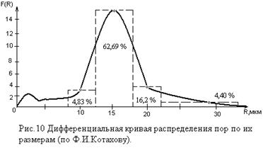 Результаты анализа, как правило, изображают в виде дифференциальных кривых распределения пор по размерам (рис.10). По оси абсцисс при этом откладывают радиусы поровых каналов в микрометрах, а по оси ординат –