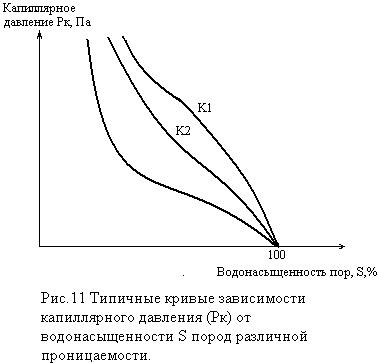 По данным всех указанный методов измерений, кроме дифференциальной кривой распределения пор по размерам, можно построить другую кривую – зависимость капиллярного давления от водонасыщенности пор (рис.11).