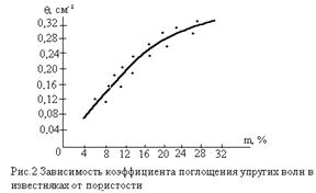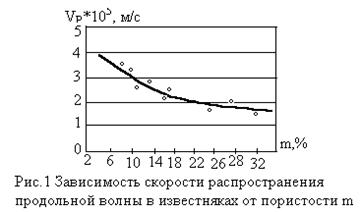 Экспериментально установлено, что с увеличением пористости пород уменьшается скорость упругих волн (рис.1) в них и увеличивается коэффициент поглощения q (рис.2)