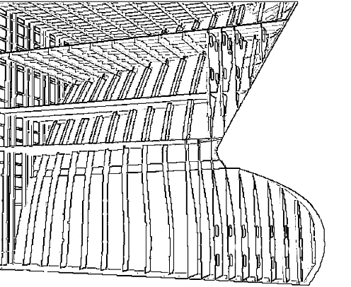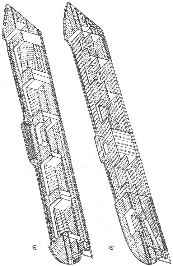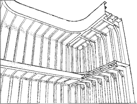Достоинством поперечной системы набора является также возможность при работе шпангоутов использовать арочный эффект. При криволинейных обводах шпангоуты под действием поперечных нагрузок обладают большей прочностью, чем при плоских. Особенно это сказывается в оконечностях, где напряжения от общего изгиба небольшие, а шпангоуты опираются на ряд горизонтальных платформ. Поэтому здесь предпочтение отдается поперечной системе набора даже на судах длиной значительно больше 100 м. Кроме этого, прочность носовой оконечности на динамические нагрузки от ударов о волны и лёд проще обеспечивается при поперечной системе набора. До конца XIX века морские корабли и суда строили только по поперечной системе набора (см. рис. 2.2).