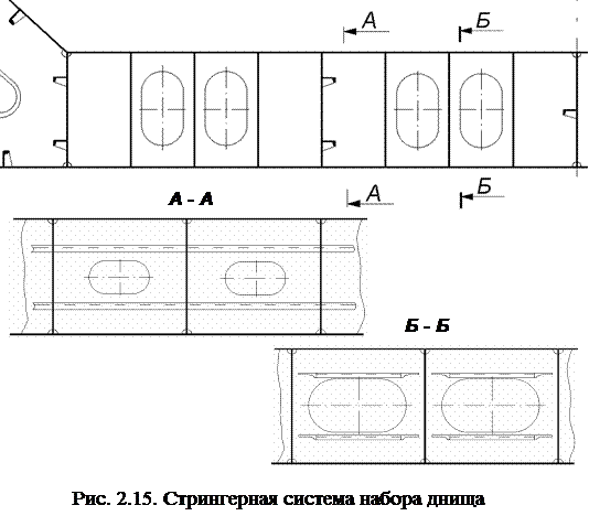Для судов длиной более 100 – 120 м применение поперечной системы набора для днища, а тем более для верхней палубы нежелательно, ввиду сложности обеспечения их устойчивости при общем изгибе судна. Продольная же система набора этих перекрытий позволяет легко обеспечить их устойчивость при сжимающих напряжениях вплоть до предела текучести материала.