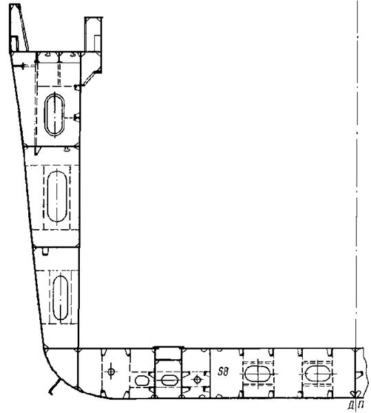Громоздкость лесных грузов и стремление к сокращению времени грузовых операций привело к большим размерам люков. Современные лесовозы относятся к типу судов с широким раскрытием палубы (открытых судов). Их особенностью является пониженная жёсткость корпуса и ослабление верхнего пояска эквивалентного бруса. Для обеспечения общей прочности и жёсткости корпуса используются различные средства: большие толщины палубного стрингера и ширстрека; подпалубные цистерны (рис. 5.1); двойные борта; непрерывные по длине судна продольные комингсы люков; прочные фальшборты, соединённые с ширстреком; спонсоны или развал бортов (рис. 5.2); продольная система набора палубы и верхней части борта.