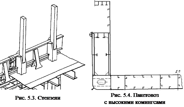 Лесовозы могут перевозить груз в виде брёвен или пиленый лес в пакетах. Для удержания груза на палубе служат вертикальные стойки – стензели, закреплённые на усиленном фальшборте (рис. 5.3), а также охватывающие палубный груз сверху найтовы. Штормовые нагрузки могут