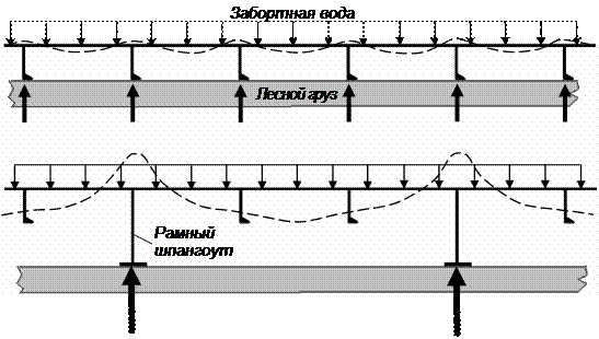 Крайне нежелательны конструкции, выступающие за общие габариты набора, например, рамные шпангоуты, так как нагрузка от брёвен на борт в этом случае не распределена по длине, а сосредоточена (рис. 5.5). Поэтому на лесовозах применяются борта с однородной системой набора или двойные борта.