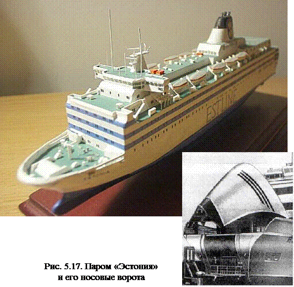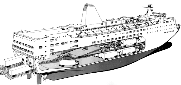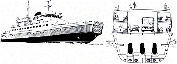 которых осуществляется преимущественно или исключительно через ворота - лацпорты в оконечностях или бортах по сходням, которые называются аппарелями или рампами (рис. 5.17, 5.18). Перевозят эти суда автомобили, трейлеры, вагоны и т.п. – то есть грузы на колёсах. Распространены грузопассажирские суда (паромы – рис. 5.19, 5.20), а также контейнеровозы – ролкеры (типа «Con-Ro» - рис. 5.21).