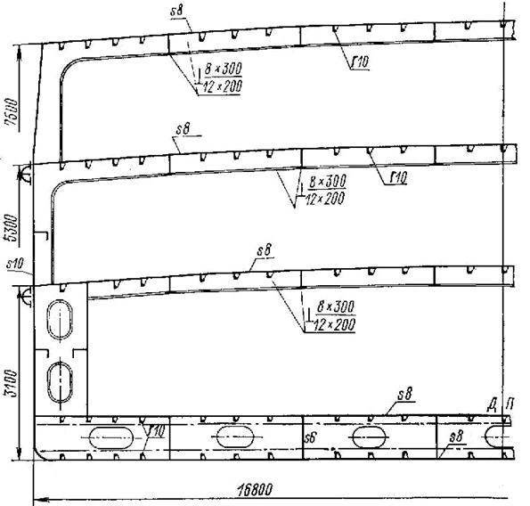 Система набора палуб – продольная (рис. 5.23). Это объясняется не столько необходимостью обеспечения общей продольной прочности (на обычных сухогрузах нижние палубы обычно имеют поперечную систему набора), сколько характером нагрузки от колёс – она близка к сосредоточенным усилиям, динамически изменяющимся вдоль судна.