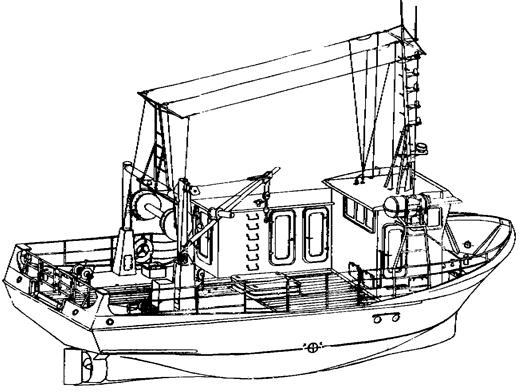 Основу добывающих судов составляют сейнеры (для ловли рыбы кошельковым неводом, выбираемым с борта – рис. 6.13) и траулеры (для ловли тралом, выбираемым с кормы - рис. 6.14). На рис. 6.15, 6.16 представлены типичные конструкции сейнера и траулера. Большинство сейнеров относится к малым (длиной до 35 м), реже – к средним рыболовным судам (длиной до 65 м). Траулеры могут быть различных размеров: от