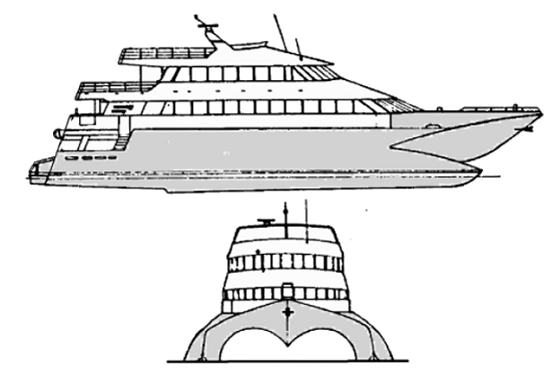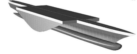 Ø дуплус (рис. 8.8) – двухкорпусное СМПВ, имеющее верхнее строение (практически - надводный корпус) и два подводных корпуса (гондолы), каждая гондола соединена с верхним корпусом узкой стойкой, вытянутой по большей части её длины;