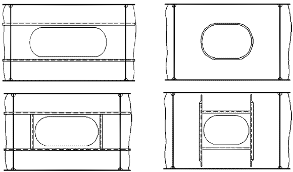 5) Облегчающие вырезы должны быть подкреплены, если они расположены в районе опор рамной связи (ближе четверти пролёта). Также подкрепления вырезов необходимы в районах действия сосредоточенных усилий или повышенной вибрации. Это правило связано с тем, что в стенках балок у опор возникают наибольшие касательные напряжения (рис. 9.4).