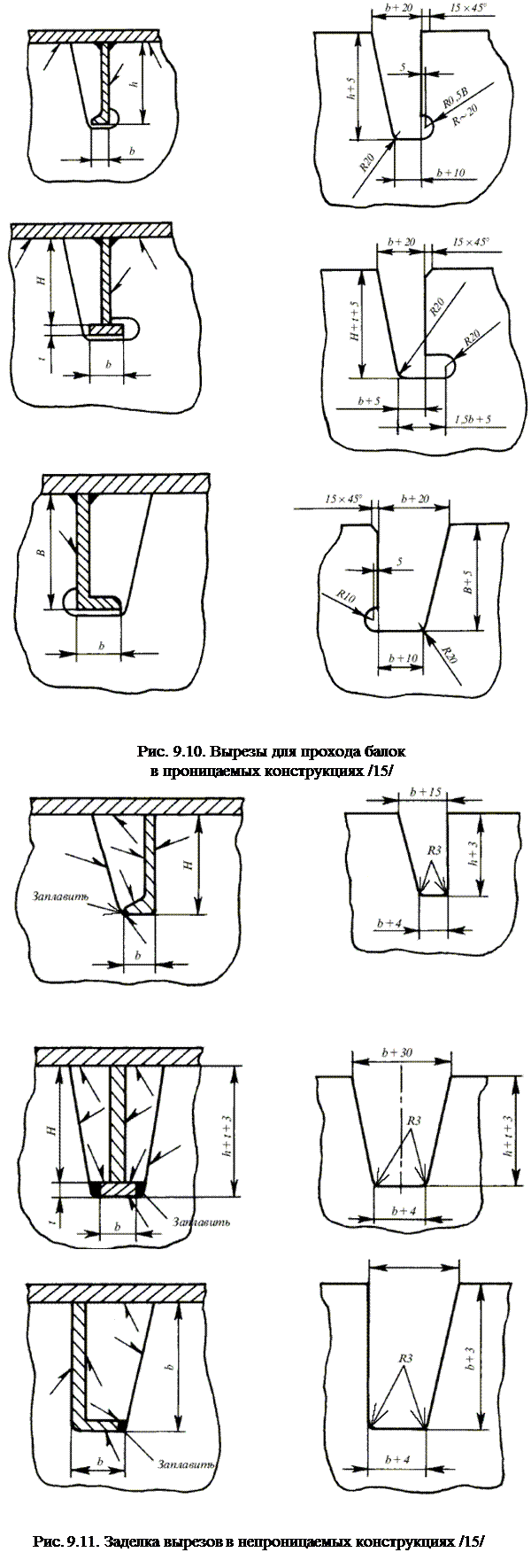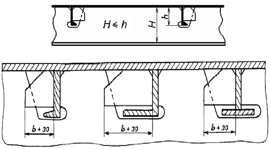 4) Расстояние от облегчающего выреза до выреза для прохода балки основного набора должно быть не менее высоты последнего (рис. 9.3).