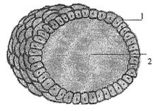1 - эктодерма; 2 - энтодерма; 3 - гастроцель, 4 - бластопор (первичный рот)