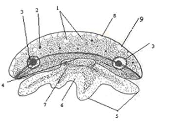Задание 4. На основании изученного материала выполнить следующие рисунки и нанести необходимые обозначения: Инфузория-туфелька (Paramaecium caudatum). 1 - макронуклеус; 2 - микронуклеус; 3 - пелликула; 4 - реснички; 5 - предротовая воронка; 6 - рот; 7 - пищеварительные вакуоли; 8 - сократительные вакуоли; 9 – трихоцисты