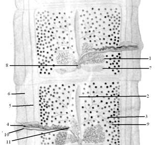 3.1. Гермафродитный членик бычьего цепня (Taeniarhynchas saginatus). На препарате видны мужская и женская половые системы, выделительные канальца.