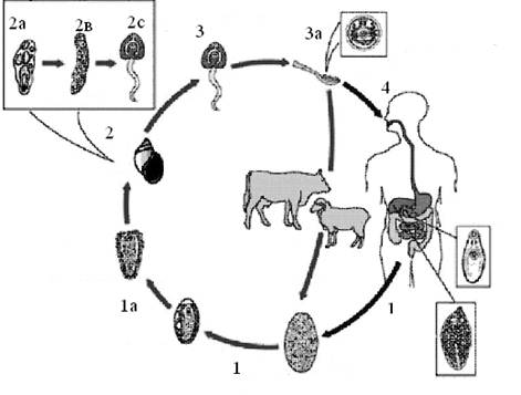 Задание 4. Изучить по учебнику циклы развития сосальщиков (трематод). Обозначить этапы биологического цикла на рисунке.
