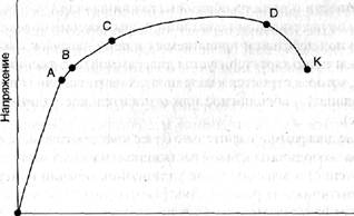 Очевидно, что при расчете изделий и конструкций на прочность максимальная нагрузка, которую может выдерживать материал, определяется ординатой точки О, несмотря на то что разрыв происходит в точке К при меньшей нагрузке.