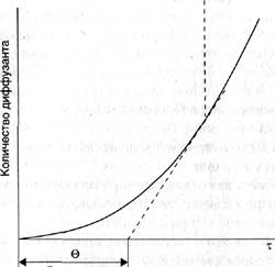 Типичная кинетическая кривая, отражающая зависимость количества диффузанта, прошедшего через мембрану, от времени (рис. 1.2), имеет два характерных участка: криволинейный, на котором процесс протекает в нестационарном режиме, и линейный, на котором процесс носит стационарный характер. Как видно из рис. 1.2, имеется некоторый интервал времени от момента начала диффузионного процесса до момента, когда устанавливается стационарный поток.