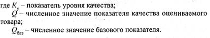 Отношение величины комплексного показателя качества товара к величине комплексного показателя базового образца характеризует уровень качества продукции. Если это отношение равно единице, то представленный товар имеет такой же уровень качества, как и базовый (эталонный) образец; если отношение меньше единицы, то уровень качества анализируемого товара ниже качества базового образца; если отношение этих показателей больше единицы, то анализируемый товар по своему качеству превышает качество эталонного (базового) образца.