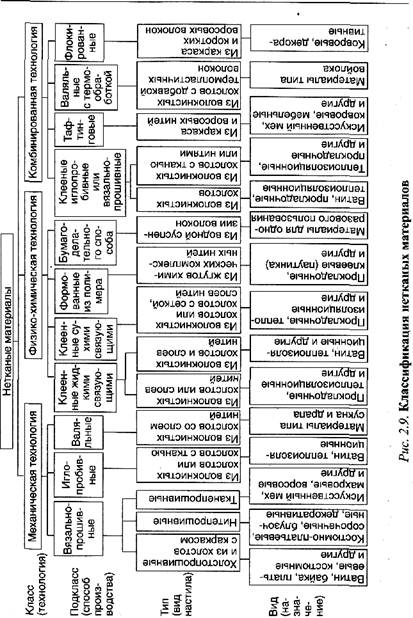 К механической технологии изготовления нетканых материалов относят вязально-прошивной, иглопробивной и валяльный способы. К физико-химической технологии относят клеевые способы, при которых скрепление настила осуществляется сухими или жидкими связующими веществами. Комбинированная технология - соединение механической и физико-химической технологии (при изготовлении одного материала сочетается два способа) (рис. 2.9).